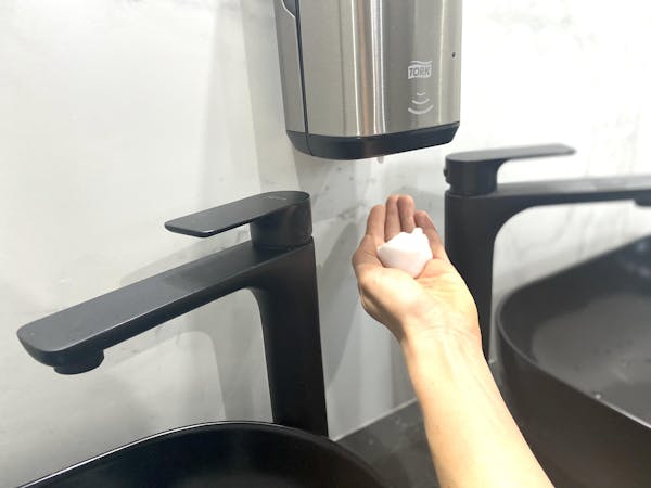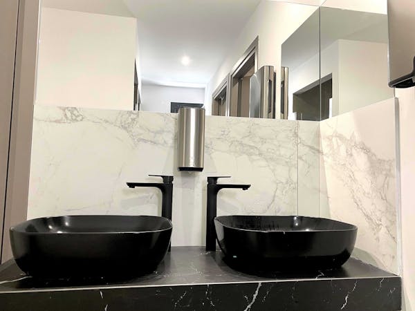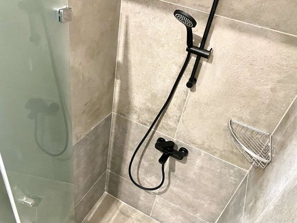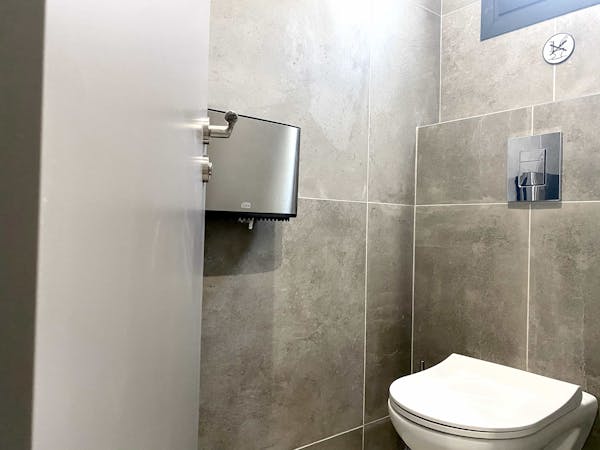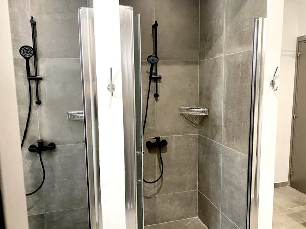 - A clean and modern female bathroom with 2 showers and 2 toilets